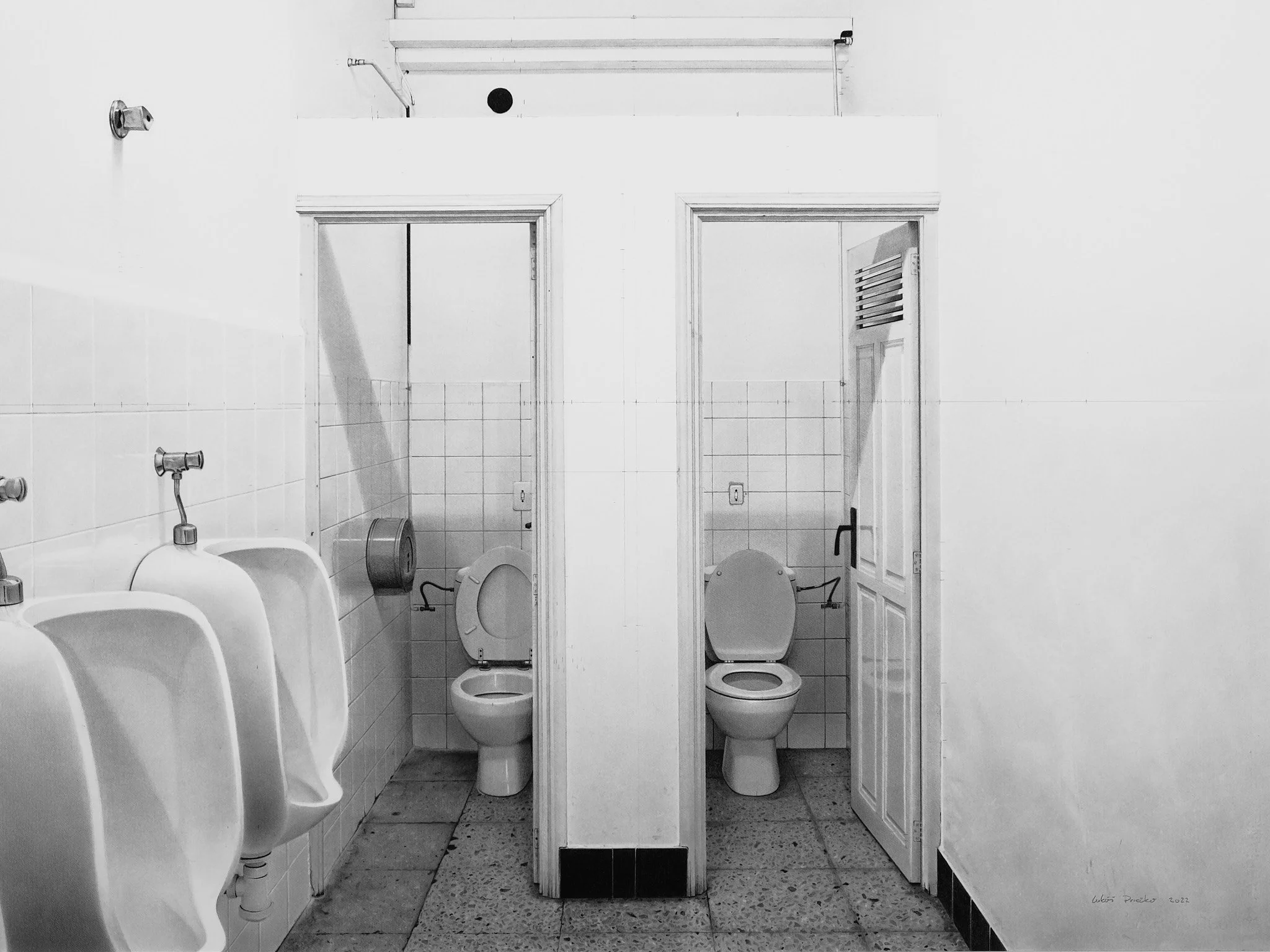One drawing, titled The Toilets, actually has a funny story behind it. I came across the scene in a glass factory in Mallorca. The door to this small restroom was left ajar, and something about the light, the space, and the quiet absurdity of it immediately caught my attention. I instinctively pulled out my camera and stepped inside, assuming the place was empty, carefully looking for the perfect composition, when suddenly, I realized there was someone using the first urinal just around the corner. But he wasn’t in my frame at all, that’s why I didn’t notice him at first. He turned and looked at me, clearly confused and maybe even a bit alarmed, wondering why someone was photographing him in such a private moment. I was completely embarrassed, mumbled something unintelligible, and rushed out. From his perspective, I must have looked completely out of place, if not suspicious. Despite the awkwardness of that moment, the image stayed with me, not just visually, but emotionally. It represents that strange overlap between the everyday and the surreal, between beauty and discomfort. That contrast is something I often seek in my work.